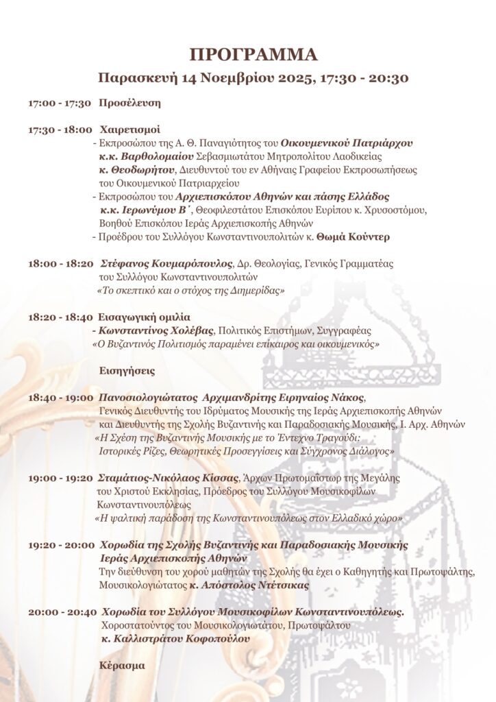 - ΔΙΗΜΕΡΙΔΑ “Η ΑΠΗΧΗΣΗ ΤΗΣ ΒΥΖΑΝΤΙΝΗΣ ΜΟΥΣΙΚΗΣ ΣΤΟΝ ΣΥΓΧΡΟΝΟ ΕΛΛΗΝΙΚΟ ΠΟΛΙΤΙΣΜΟ” – Παρασκευή 14 & Σάββατο 15 Νοεμβρίου 2025 6 Νοεμβρίου 2025
