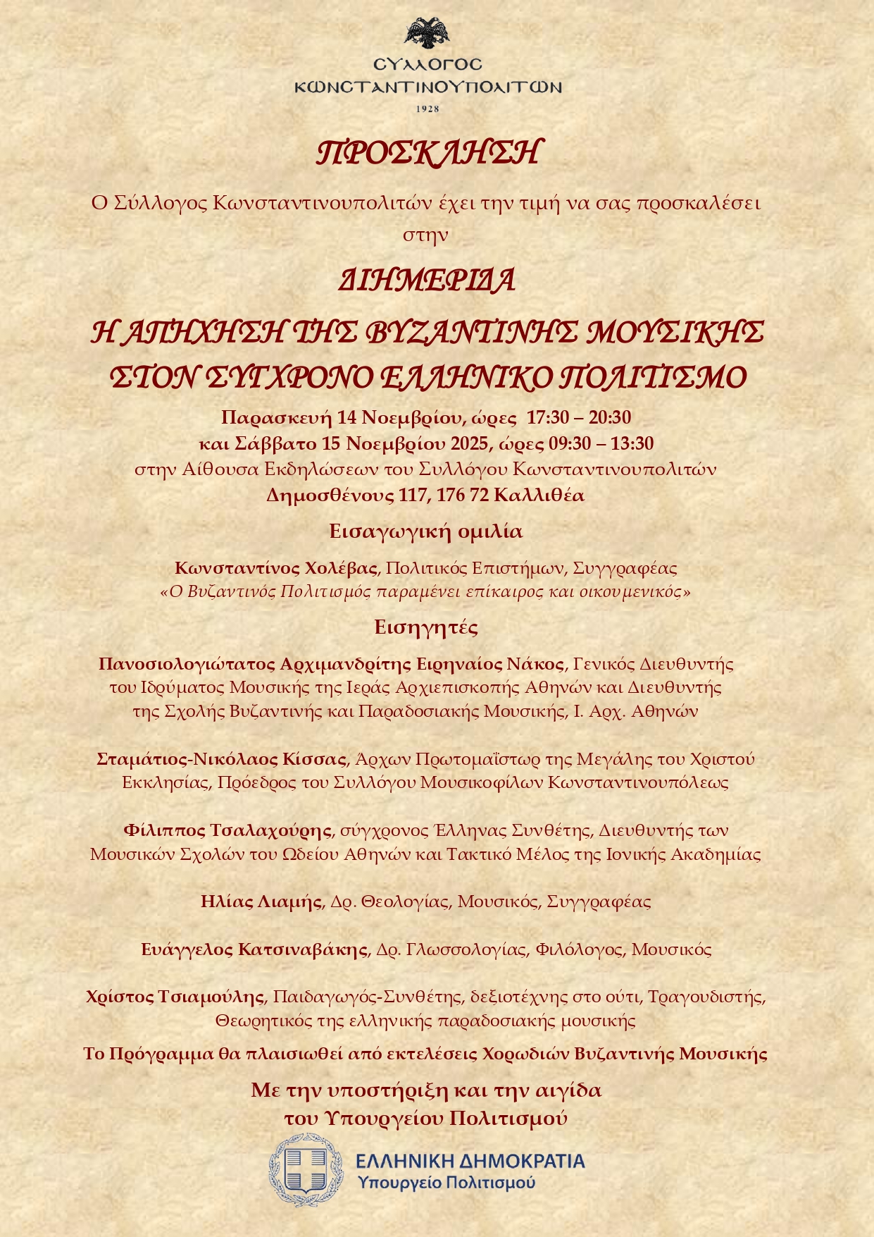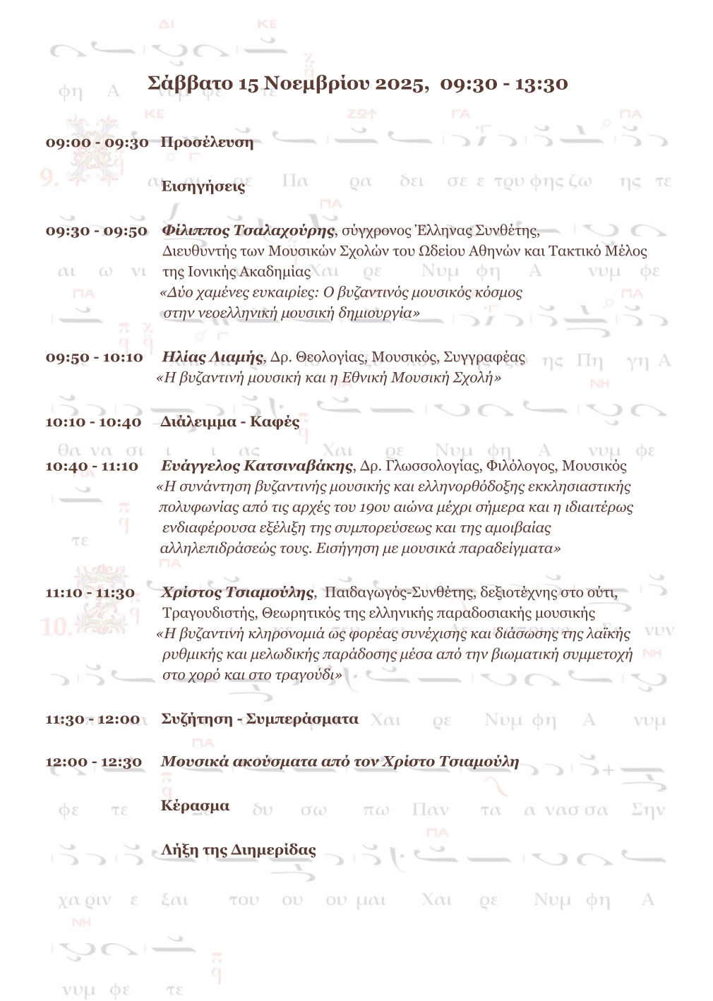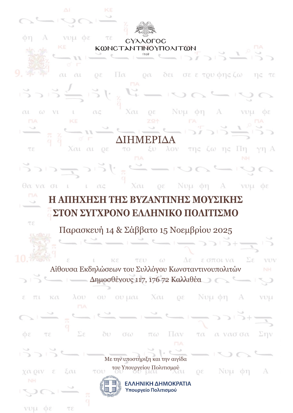 - ΔΙΗΜΕΡΙΔΑ “Η ΑΠΗΧΗΣΗ ΤΗΣ ΒΥΖΑΝΤΙΝΗΣ ΜΟΥΣΙΚΗΣ ΣΤΟΝ ΣΥΓΧΡΟΝΟ ΕΛΛΗΝΙΚΟ ΠΟΛΙΤΙΣΜΟ” – Παρασκευή 14 & Σάββατο 15 Νοεμβρίου 2025 6 Νοεμβρίου 2025
